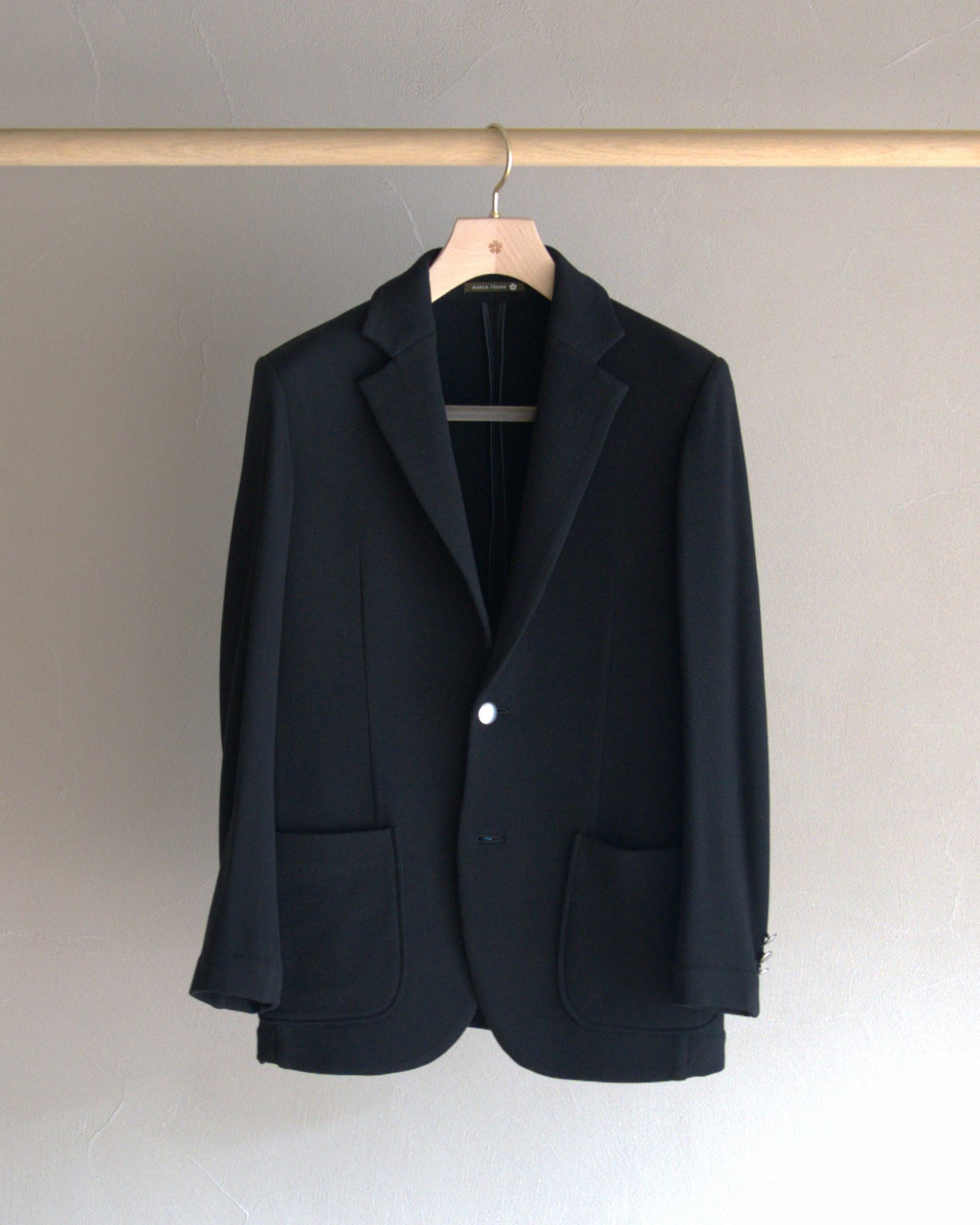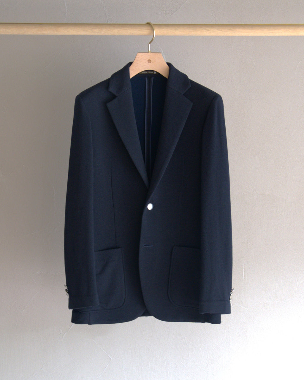 こちらは新モデルで、タイト過ぎないサイジング。ソフトなジャージーでありながら仕立て技術の光る端正なシルエット。