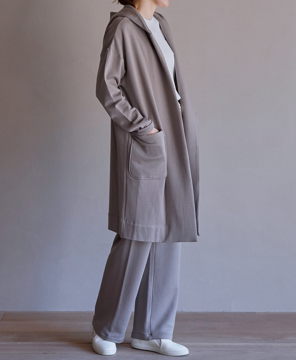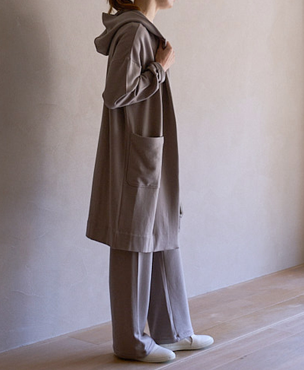 フード付きカーディガンはコートよりも手軽に軽く羽織れ、カーディガンより着映えし、インナーにライトダウンなどをレイヤードすればとても暖かく、暖冬傾向の今の気候にぴったり。