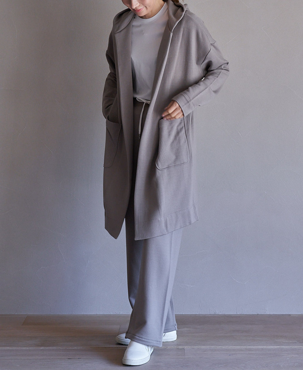 テンセルのなめらかさにカシミヤの艶も相まって、カジュアルな印象のイージーパンツも落ち感が美しくエレガントな表情。