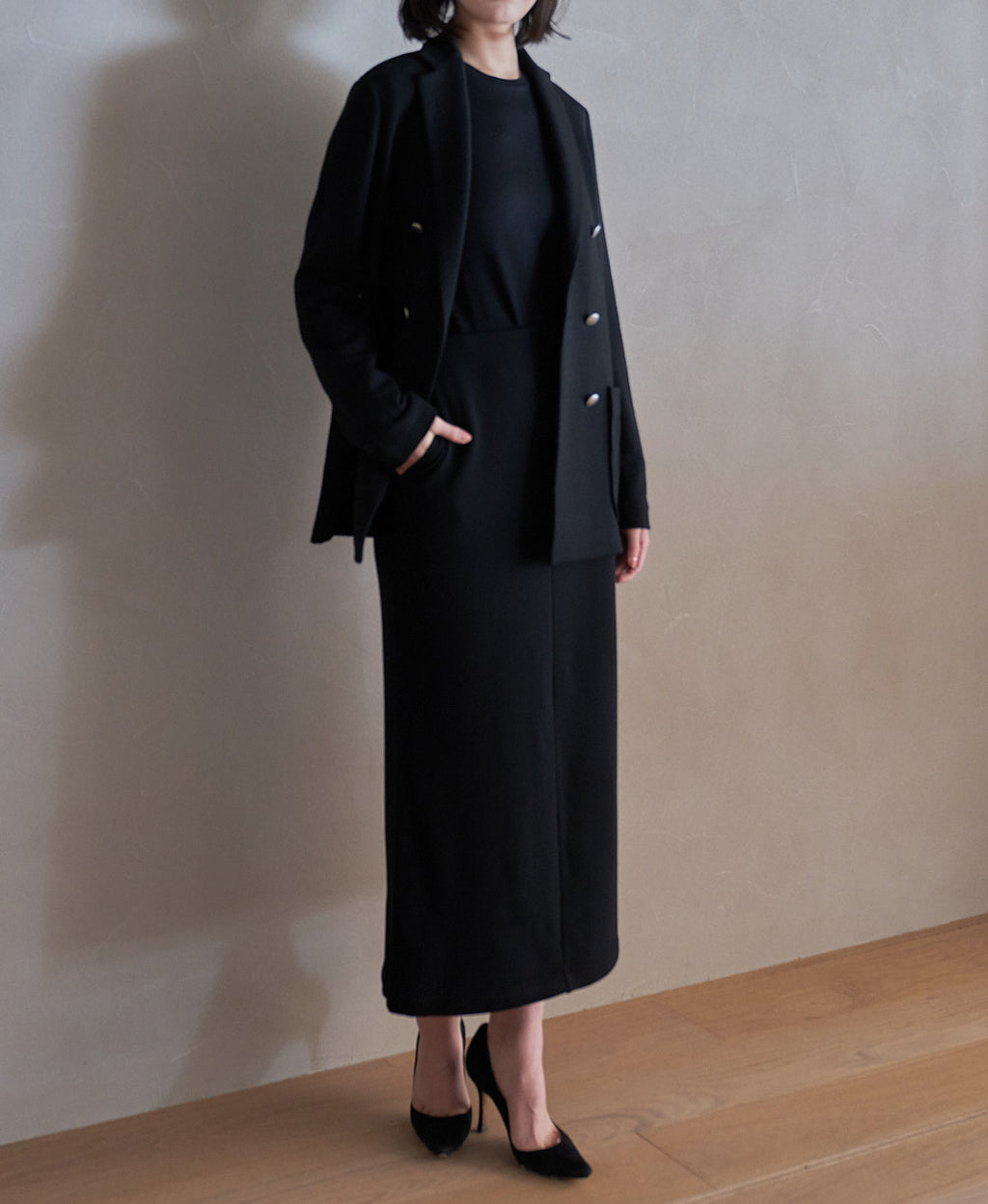 ウエストはイージーなゴム仕様、ヒップはタイトになり過ぎない絶妙なラインを追求したすっきり見せるストレートラインのロングスカート。