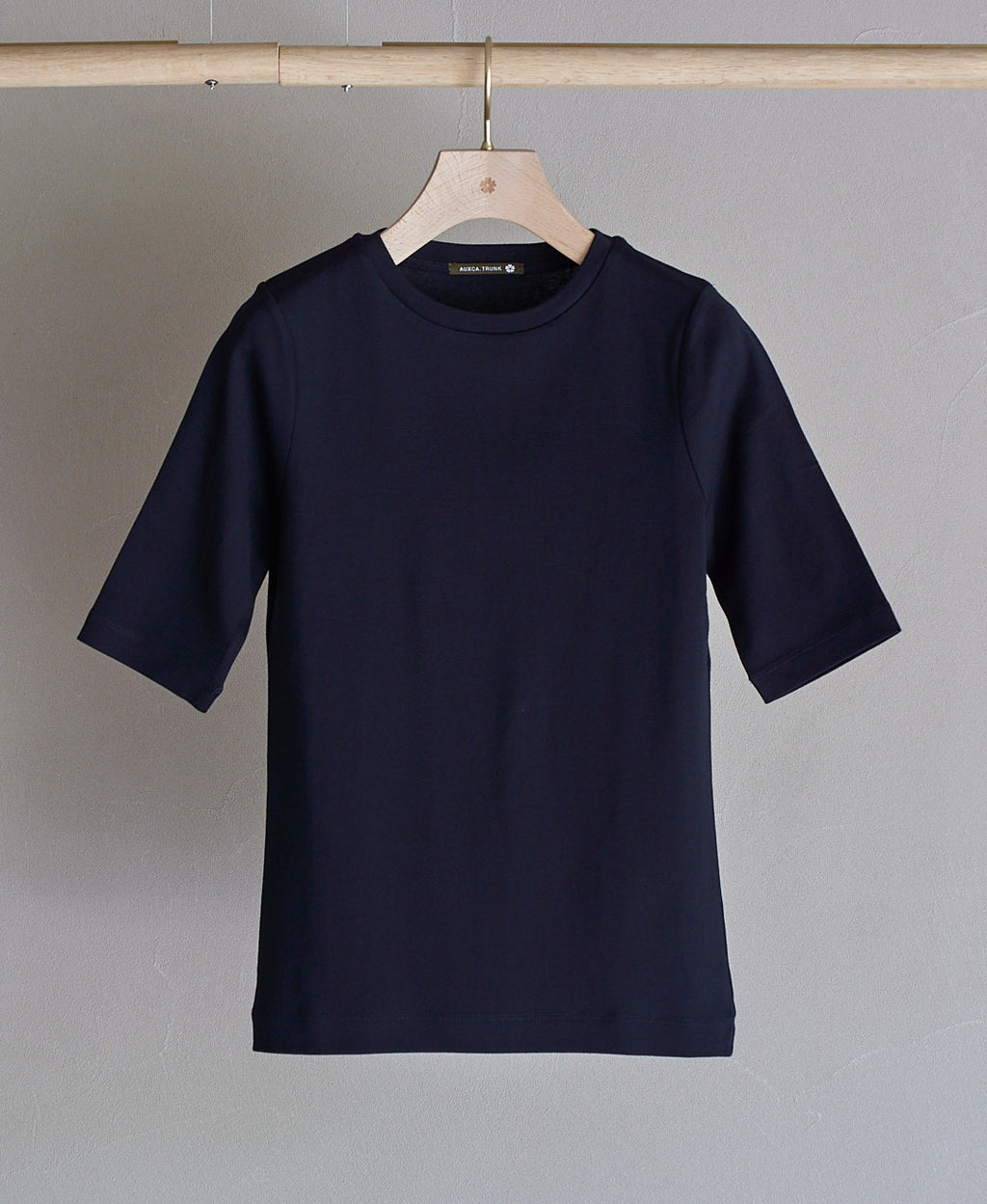 襟あきは小さめのクルーネックで端正な印象を与え、1枚での着用でもジャケットのインナーにお召いただきやすいデザイン。