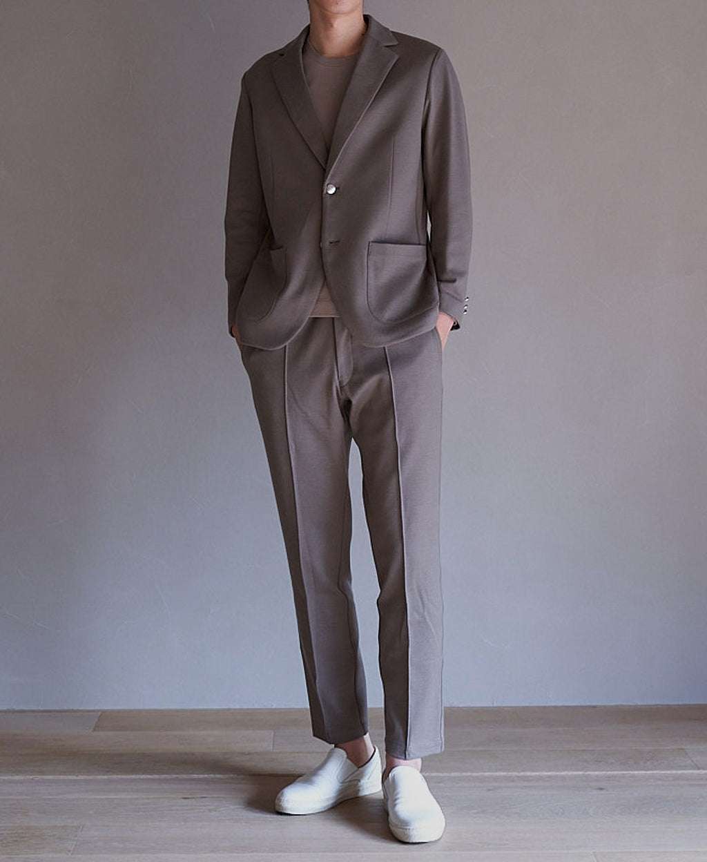 同素材ジャケットとのセットアップスタイルにすればエレガントなスーチングスタイルが完成。